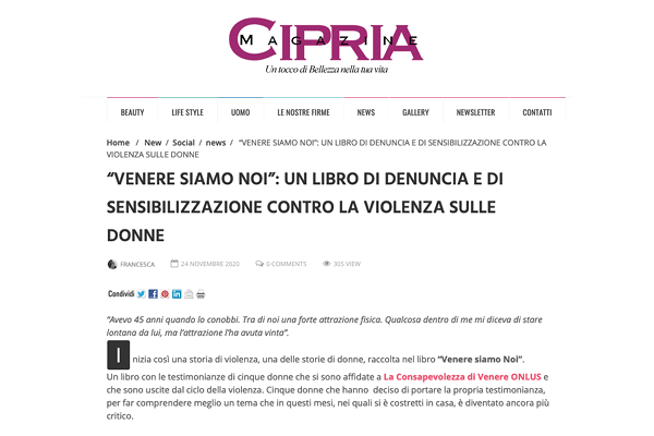 Inizia così una storia di violenza, una delle storie raccolte nel libro "Venere siamo noi". Un libro con le testimonianze di cinque donne che si sono affidate a La Consapevolezza di Venere ONLUS e che sono uscite dal ciclo della violenza.